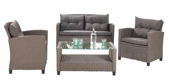 Cadre en aluminium • Wicker demi-rond 7mm • Canapé 2 places 124cm • 2 fauteuils • Table L92 X l56 X H43cm avec plateau en verre • Coussins inclus