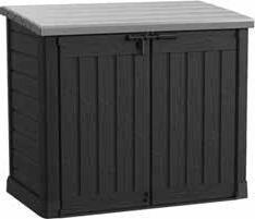 Anthracite et gris clair • Plastique • 146 x 82 x 125 cm (l x P x H) • L'étagère supplémentaire peut être facilement installée avec les supports réglables inclus • Garde son contenu sec et ventilé • Stocke 2 poubelles de 240 L • Couvercle avec ressorts à gaz • Résistance aux intempéries • Résistance aux UV • Facile à assembler et à nettoyer