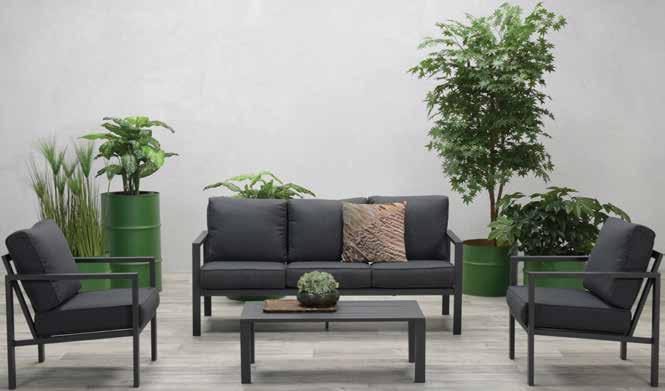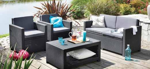 ENSEMBLE LOUNGE 'MONACO' Résine tressée • Graphite • Canapé 2 places L129 x l63 x H77cm • 2 fauteuils L65 x l63 x H77cm • Table L92 x l59 x H43cm • Coussins anthracite