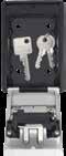 Boîtier métallique robuste • Clapet en zinc coulé sous pression • Code personnalisable à 4 chiffres • Clapet de protection avec mécanisme coulissant • Pour fixation au mur avec vis • En noir/ argenté • L80 x P45 x H120mm