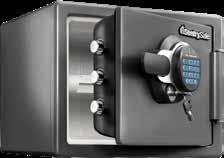 H348 X l415 X P491mm • 23L • Ignifuge 60 min. / étanche à l’eau 24h dans un niveau d’eau de 12 cm • Avec éclairage LED, étagère et 5 crochets à clé • Serrure combinaison électronique (libre à programmer) + une serrure à clé