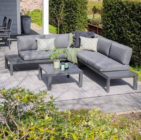 Cadre en aluminium, carbon black / mystic grey • Canapé d'angle L240 x l240 x H72 cm • Table basse L75 x l75 x H35cm • Hauteur d'assise 42 cm • Avec coussins imperméables 10cm 680136/D