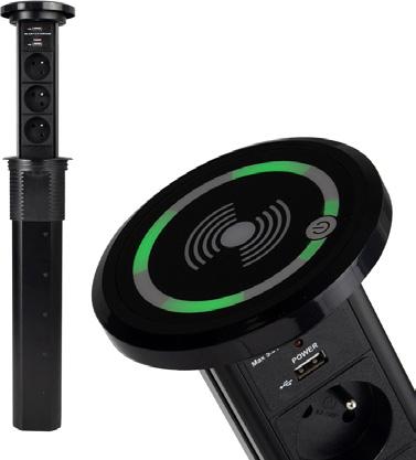 LIFT BOX multiprise rétractable automatiquement avec USB et chargeur à induction. L’unité est destinée à être installée dans les plans de travail de cuisine, de conférence, de bureau, et divers mobiliers. Il dispose de 3 prises 230V AC max 16A et 2 ports USB max 16A. 5V DC / 2.0A (total 10.5W) avec un chargeur inductif intégré. Caretéristiques : Tension : 230V. Charge max 3600W. Protection : IP20. Diamétre de perçage du montage : Ø93mm Longueur du câble 2m. Matière : PVC/Aluminium. Couleur : Noir Type USB : USB type A 586050