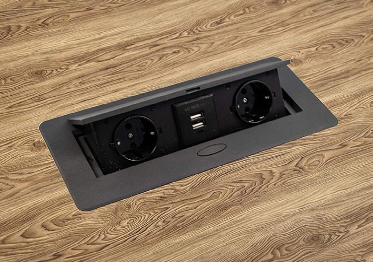 LIFT BOX multiprise rétractable automatiquement avec USB et chargeur à induction. L’unité est destinée à être installée dans les plans de travail de cuisine, de conférence, de bureau, et divers mobiliers. Il dispose de 3 prises 230V AC max 16A et 2 ports USB max 16A. 5V DC / 2.0A (total 10.5W) avec un chargeur inductif intégré. Caretéristiques : Tension : 230V. Charge max 3600W. Protection : IP20. Diamétre de perçage du montage : Ø93mm Longueur du câble 2m. Matière : PVC/Aluminium. Couleur : Noir Type USB : USB type A 586050