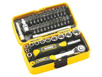 10 douilles : 5,5, 6, 7, 8, 9, 10, 11, 12, 13, 14mm. 1 joint universel. 2 barres d’extension 50mm et 100mm. Poignée à 1 spinner. 1 coupleur. 1/4” DR. × 1/4” HEX. 22 bites : (+) 1, 2, 2, 3. (-) 3, 4, 5, 6. (*) 1, 2, 3. (H) 3, 4, 5, 6. (T) 10, 15, 20, 25, 27, 30, 40. Antidérapant. 313060
