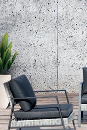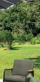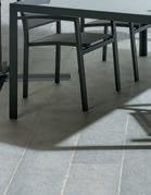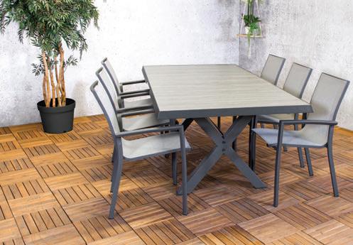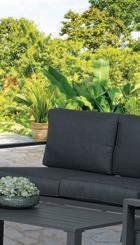 Cadre en aluminium, carbon black / mystic grey. Canapé d’angle L240 x l240 x H72 cm. Table basse L75 x l75 x H35cm. Hauteur d’assise 42 cm. Avec coussins imperméables 10cm.