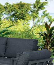 Cadre en aluminium, carbon black / mystic grey. Canapé d’angle L240 x l240 x H72 cm. Table basse L75 x l75 x H35cm. Hauteur d’assise 42 cm. Avec coussins imperméables 10cm.
