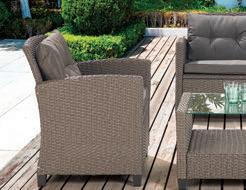 Cadre en aluminium Wicker demi-rond 7mm. Canapé 2 places 124cm. 2 fauteuils. Table L92 x l56 x H43cm avec plateau en verre. Avec coussins.