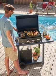 Bac à graisse intégré contenance 1 l. Pieds réglables à l’arrière. Manettes de réglage avec allumage brûleur intégré.