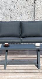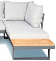 Aluminium frame & FSC acacia wood. 2 banken L175 x B78 x H70cm. Tafel L70 x B35 x H38cm (2 toepassingen mogelijk). Met kussens 10cm en zachte rugkussens.