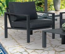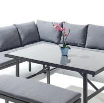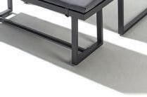 Aluminium frame & FSC acacia wood. 2 banken L175 x B78 x H70cm. Tafel L70 x B35 x H38cm (2 toepassingen mogelijk). Met kussens 10cm en zachte rugkussens.