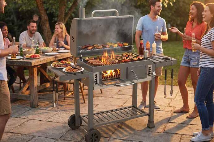 Bakoppervlak 48 x 41 cm. Roestvrijstalen rooster met grilsysteem in het rooster voor een gelijkmatige verdeling van de hitte. In hoogte verstelbare houtskoolbak voor nauwkeurige temperatuurcontrole. Handig, met opzij een uitklapbaar blad voor accessoires en ingrediënten. L104 x D65 x H109 cm. 692515/S