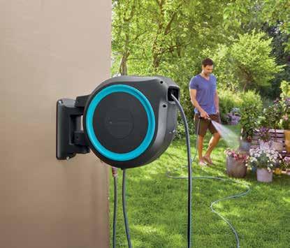 Perfecte opberging voor slangen. Kan in een hoek van meer dan 180° worden gedraaid. Vergrendelt automatisch op de gewenste lengte. Klaar voor onmiddellijk gebruik. RollControl-technologie: zorgt ervoor dat de slang langzaam en veilig oprolt, ongeacht hoe ver ze is afgerold. UV- en vorstbestendig