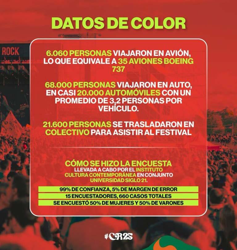 El público del festival se distribuye principalmente entre Córdoba (43.6 %) y Buenos Aires (40.5 %), seguido por Santa Fe (7.2 %) y otras provincias (8.7 %). En cuanto a la movilidad, el 76 % de los asistentes se trasladó en vehículo particular, el 14 % utilizó servicios de buses o charters y el 10 % restante otros medios de transporte.