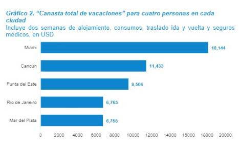 de tres estrellas, comidas, bebidas, transporte local, sin la inclusión de pasajes aéreos ni seguro médico. Por el otro lado, la canasta total de vacaciones, que incluyó todo lo mencionado anteriormente con el agregado de los boletos aéreos y la asistencia al viajero. Tras esto, se confirmó que la estadía en Río de Janeiro, que según el Embratur fue uno de los destinos más concurridos en estos últimos dos meses y se posicionó como un sitio mucho más económico que Mar del Plata, en términos de canasta de estadía. Incluso, el estudio también detalló que, si se compara en materia de canasta total de vacaciones, la ciudad brasilera se mantuvo el mismo precio que lo que pudo registrar con el principal destino en la Costa Atlántica argentina.