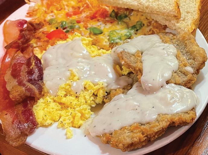 Scrambled eggs between 2 country steaks and topped with country style pan gravy. Served with of breakfast potatoes or browns 15.49