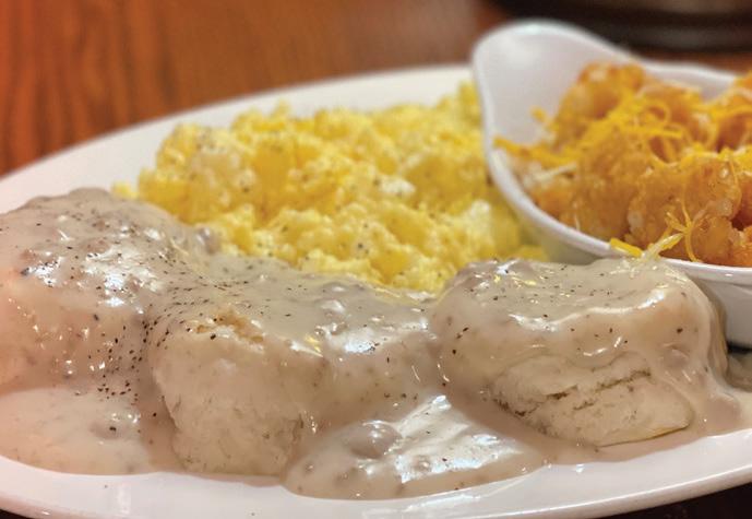 Buttermilk biscuits topped with 2 over-medium eggs and country style sausage gravy 13.99