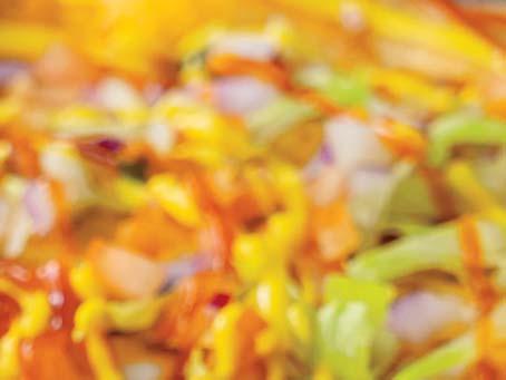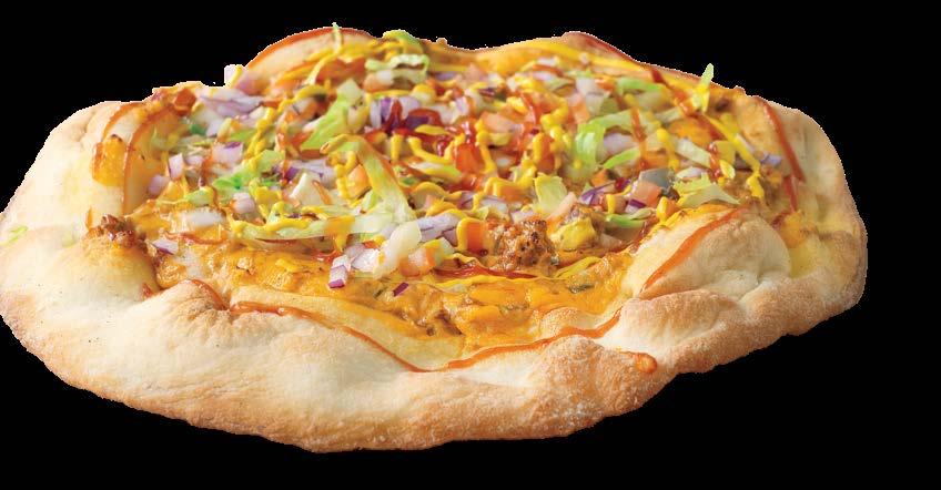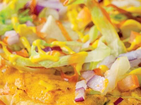 Pork al pastor atop a crispy flatbread with red onion, peppers, cheese, and cilantro, creating a shareable dish or satisfying entrée while tapping into street food trends and driving high-profit margins.