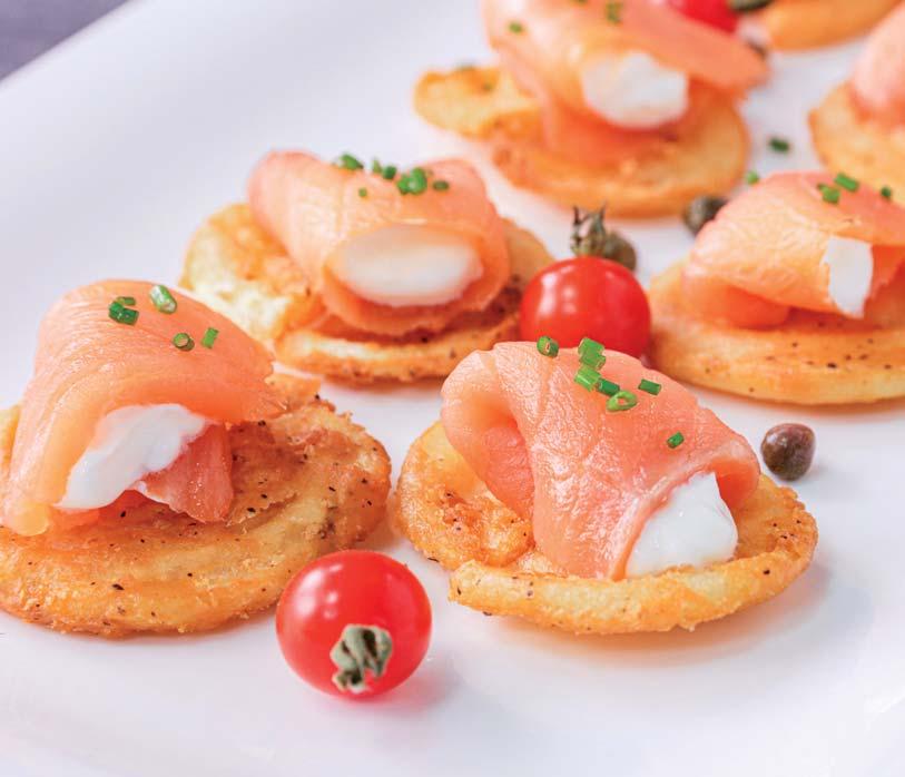 Top swirl fries with cream cheese, smoked salmon, capers, and herbs for an elegant take on a classic pairing that’s ideal for brunch or upscale snacking menus.