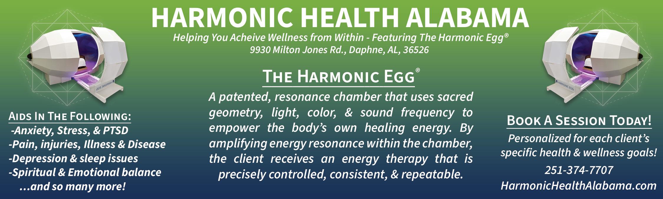 Harmonic Health Alabama features the Harmonic Egg, a science-based, sound and light therapy for physical, emotional and spiritual energy healing. Please call, text or visit our website for more information! See ad, page 31