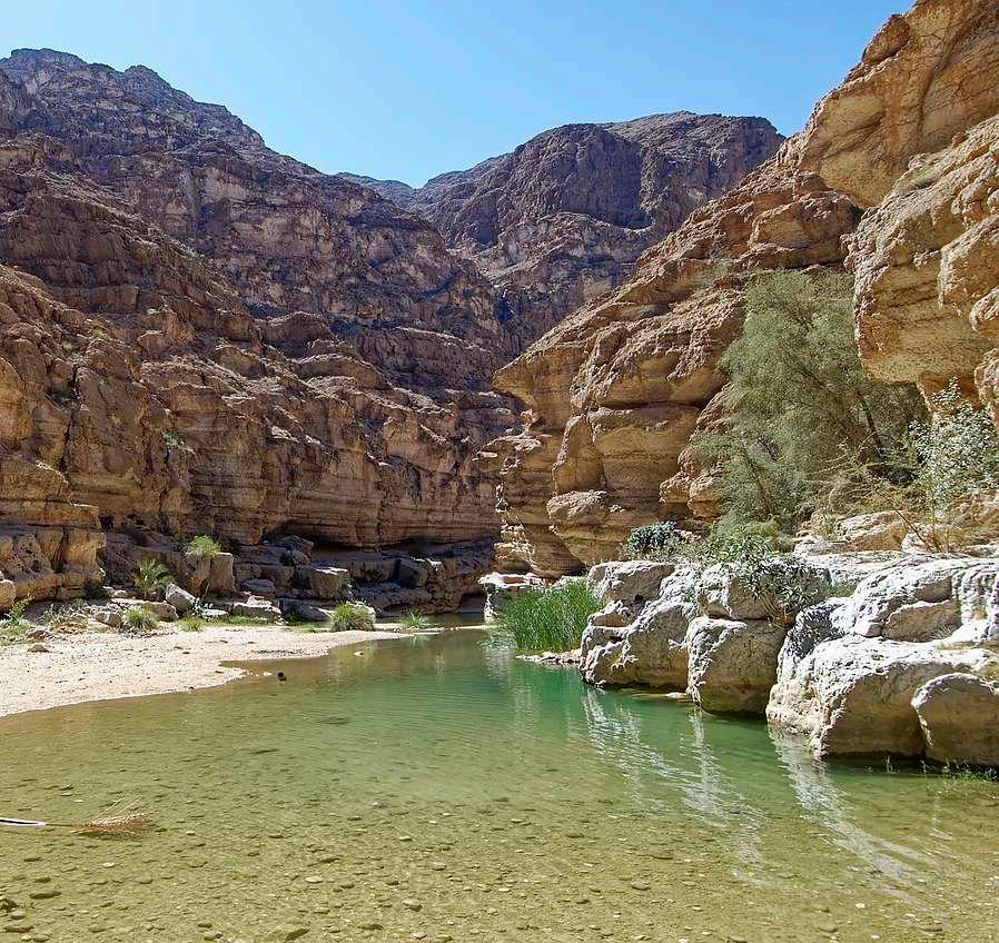 Oman's natural landscape and diverse geography invite adventure. The Al Hajar Mountains, which stretch across the north of the country, are ideal for hiking and climbing, with panoramic views of deep valleys and picturesque villages. Jebel Shams, the highest mountain in Oman, is known as the "Grand Canyon of the Middle East" due to its impressive rock formations. But it is the undulating dunes of the Wahiba Sands desert, mysterious and in fi nite, that provide an unforgettable camping experience under a starry sky and where from time to time you can see the famous oases, or wadis, such as Wadi Shab and Wadi Bani Khalid, with natural pools, authentic monuments where we feel that the perfection of nature is magnanimous.