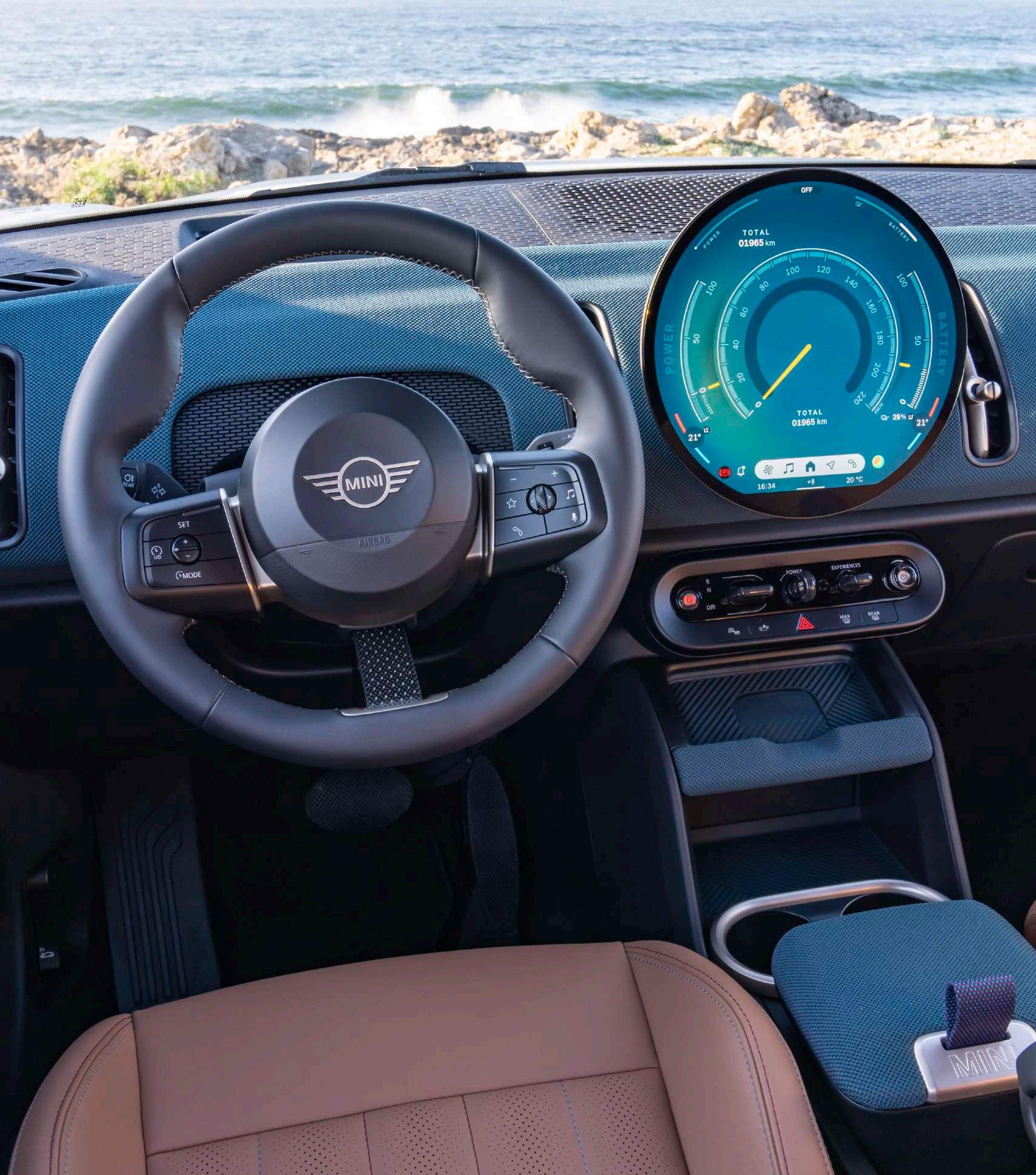 Se o exterior seduz, o interior confirma a ambição da nova geração. No centro do habitáculo destaca-se o inovador ecrã circular OLED — uma reinterpretação digital do icónico velocímetro central que durante décadas definiu os modelos MINI. O ambiente é contemporâneo, acolhedor e marcadamente lifestyle. Materiais sustentáveis, superfícies têxteis e uma paleta de cores cuidadosamente escolhida criam uma atmosfera que se aproxima mais do design de interiores do que do universo automóvel tradicional.