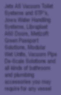 For the latest news and analysis go to www.motorship.com SEPTEMBER 2023 | 45 PRODUCTS & SERVICES DIRECTORY SPARE PARTS High quality underwater repairs Hydrex offers underwater repair solutions to shipowners around the globe. Our experienced teams are qualified to perform all class-approved repair procedures in even the harshest conditions. Hydrex headquarters Phone: +32 3 213 53 00 (24/7) E-mail:hydrex@hydrex.be www.hydrex.be Hermann-Blohm-Str. 1 · D-20457 Hamburg Phone +49 40 317710-0 · Fax +49 40 311598 E-mail info@nds-marine.com www.nds-marine.com Our reliability.Your move. Big enough to handle it Small enough to care Your Ship Repair Yard in Lisbon Estaleiro da Rocha Conde de Óbidos 1399 –036 Lisboa –PORTUGAL Tel. Yard (+ 351) 213 915 900 www.navalrocha.com navalrocha@navalrocha.pt TESTING & ANALYSIS SHIPREPAIR TEMP CONTROL TURBOCHARGERS WASTE WATER ENGINEERING CO. LTD. TEMPERATURE CONTROL VALVES Comprehensive range of 3-way Valves suitable for Fresh Water, Lubricating Oil and Sea Water Systems Wide choice of materials. Robust construction, low maintenance, simple to use and cost effective method of temperature control Tel: +44 (0) 1727 855616 Fax: +44 (0) 1727 841145 E-mail: Sales@waltonengineering.co.uk Website: www.waltonengineering.co.uk DIRECT • PNEUMATIC • ELECTRIC • GAS PRESSURE OPERATED VALVES Start Systems for Two and Four-Stroke Engines Please visit: www.seitz.ch LABORATORY ANALYSIS FOR THE MARINE INDUSTRY Tel: +44 (0) 1256 704000 Email:enquiries@spectro-oil.com Web: spectro-oil.com For more information contact us Phone: +44 141 880 6939 Email: mrhmarineoff@btconnect.com Or visit: www.mrhmarine.com Jets AS Vacuum Toilet Systems and STP’s, Jowa Water Handling Systems, Libraplast A60 Doors, Metizoft Green Passport Solutions, Modular Wet Units, Vacuum Pipe De-Scale Solutions and all kinds of bathroom and plumbing accessories you may require for any vessel 10 30 60 70 70 2950 SW 2nd Avenue Ft. Lauderdale, FL 33315 Toll free: 877-887-2687 Telephone: 954-767-8631 Fax: 954-767-8632 Email: info@turbo-usa.com www.turbo-usa.com Installing Turbocharger Confidence TURBOCHARGERS ABB Turbo MarineCare Predictability in a changing world Full range of CP Propulsion Systems • Reduction Gearboxes 150 • 12000 kW • PTO - PTI and 2 - Speed solutions • 3 - 4 and 5 bladed CP Propellers Ø1-6m dia • Fifth Generation Electronic Remote Controls • Nozzles NACA 19A Finnøy High Speed Finnøyveien 195 6487 Harøy NORWAY (+47) 712 76 000 post@finnoygear.no PUMPS PROPULSION
