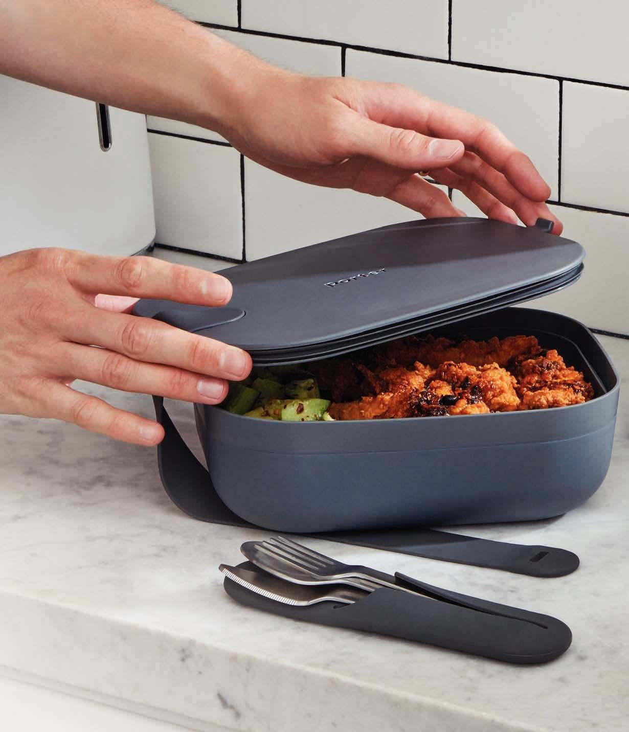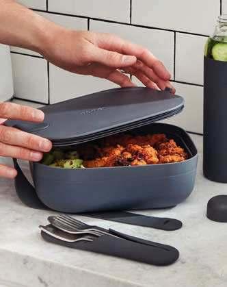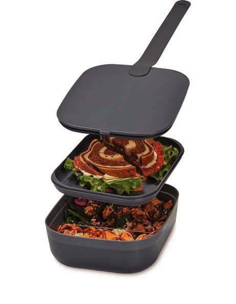 A fresh take on the classic lunch box. The bento box design features 3 food storage compartments. The roomy bowl is perfect for large salads while the tray holds chips, sandwiches or fruit. Lightweight and compact, it fits neatly in bags.