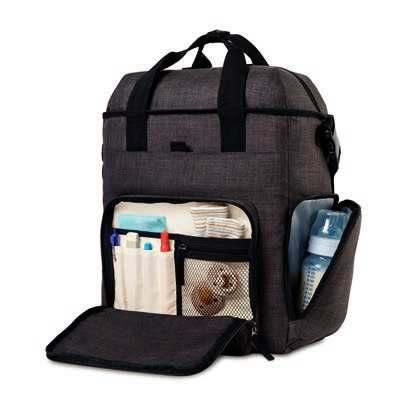We love the easy way this carryall attaches to a stroller, secures to a suitcase and can be thrown over the shoulder or grabbed by the handles! It gives busy parents lots of handsfree flexibility on the go. Features an exterior, insulated bottle pocket and multi-function organizer. Made with recycled fabric (rPET) made from plastic bottles.