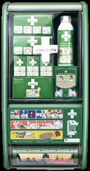 2st blodstoppare, 3st mini blodstoppare, 1st burn gel, 1st Eye&Wound cleansing spray, 1st Soft Foam dispenser, 1st plåsterautomat, 1st sårtvättare, 1st skyddspaket.