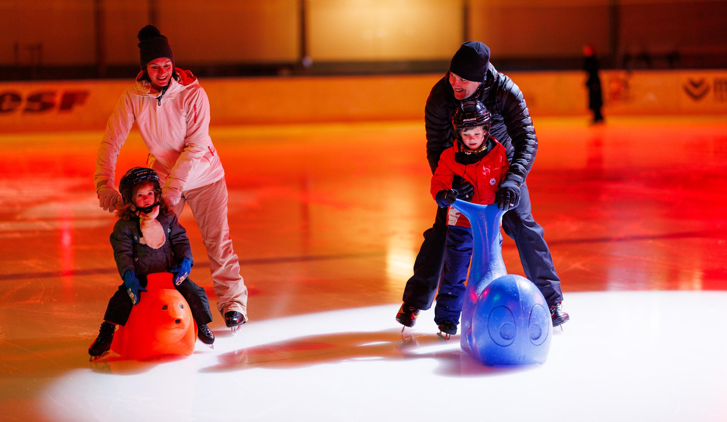 La patinoire offre 1800 m2 de glace pour le plaisir de patiner ! Des activités distrayantes raviront petits et grands grâce au matériel ludique mis à votre disposition (patinettes, supports de glisse : pingouins, chaises, casques…) pour pratiquer le patinage de manière conviviale et sécurisée.