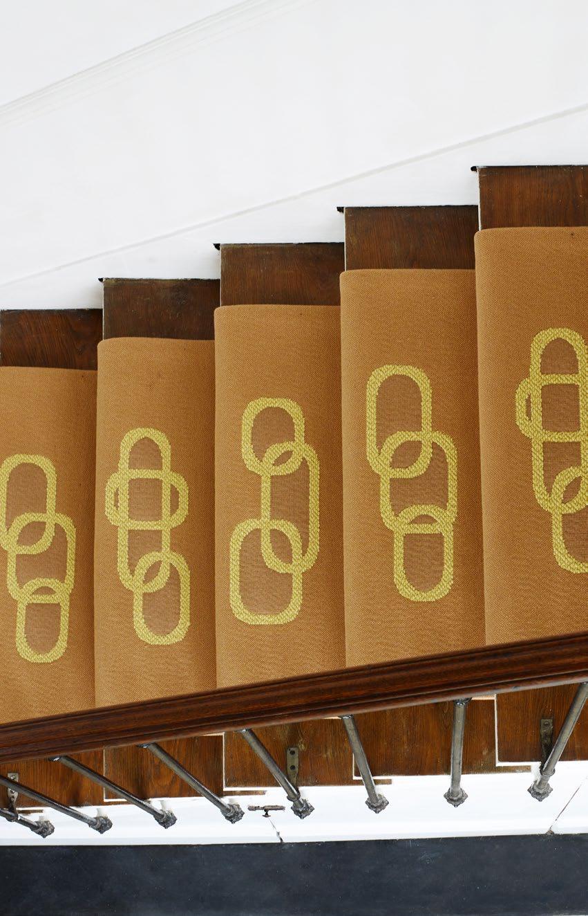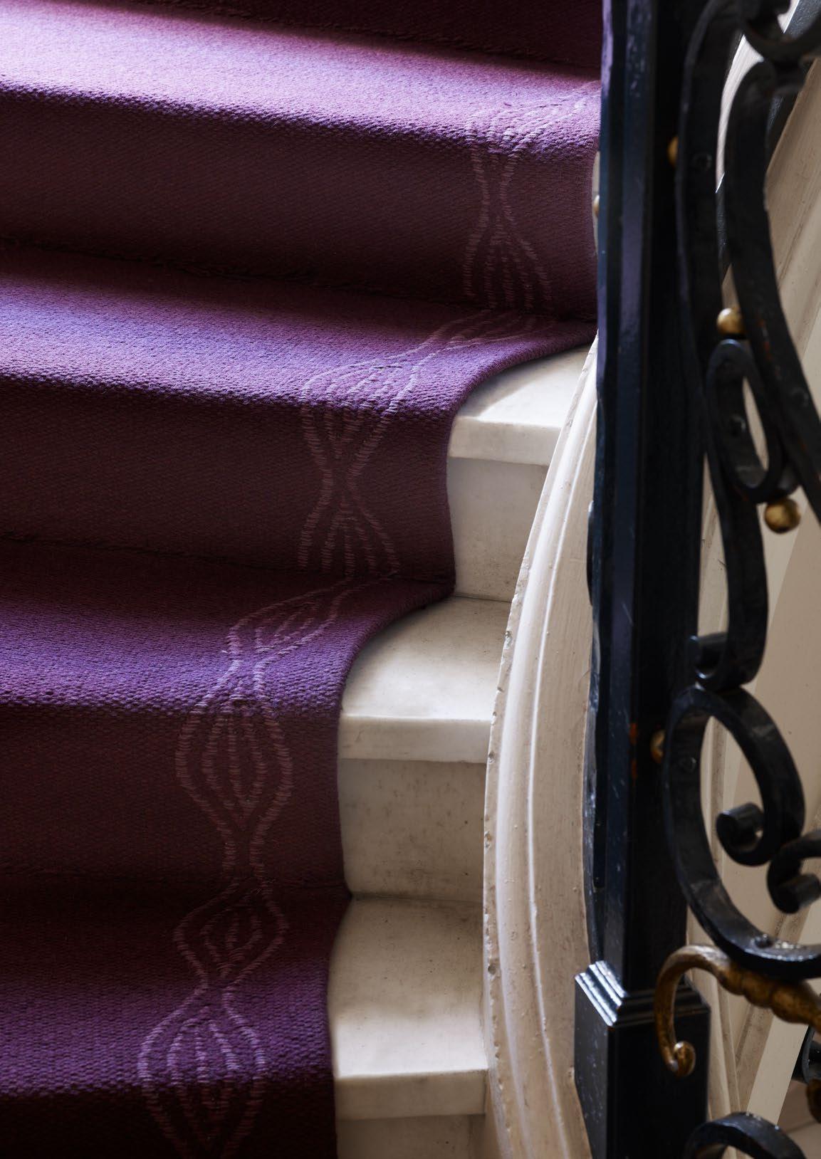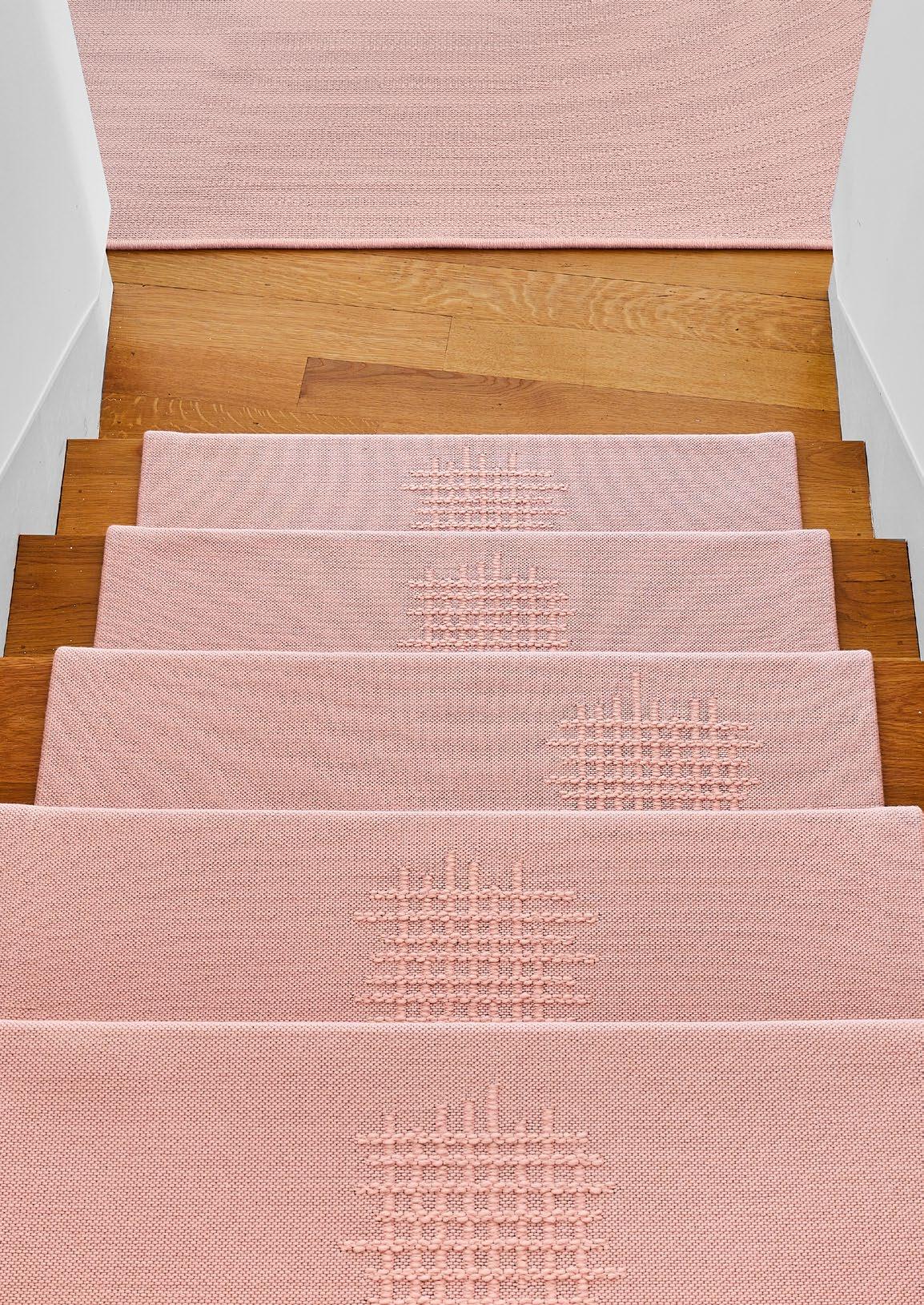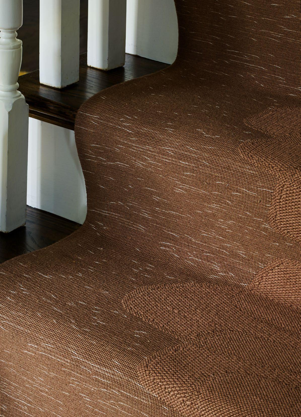 Our stair designs often differentiate the treads from the risers so that moving up feels different from moving down. Because stairs exist in three dimensions, the way a runner is seen and experienced changes with every angle and step. By shaping the weave, pattern, and texture to respond to these shifts, we create a journey that is dynamic and intentional—each ascent and descent revealing new surfaces, subtle textures, and the full sculptural presence of the stair.