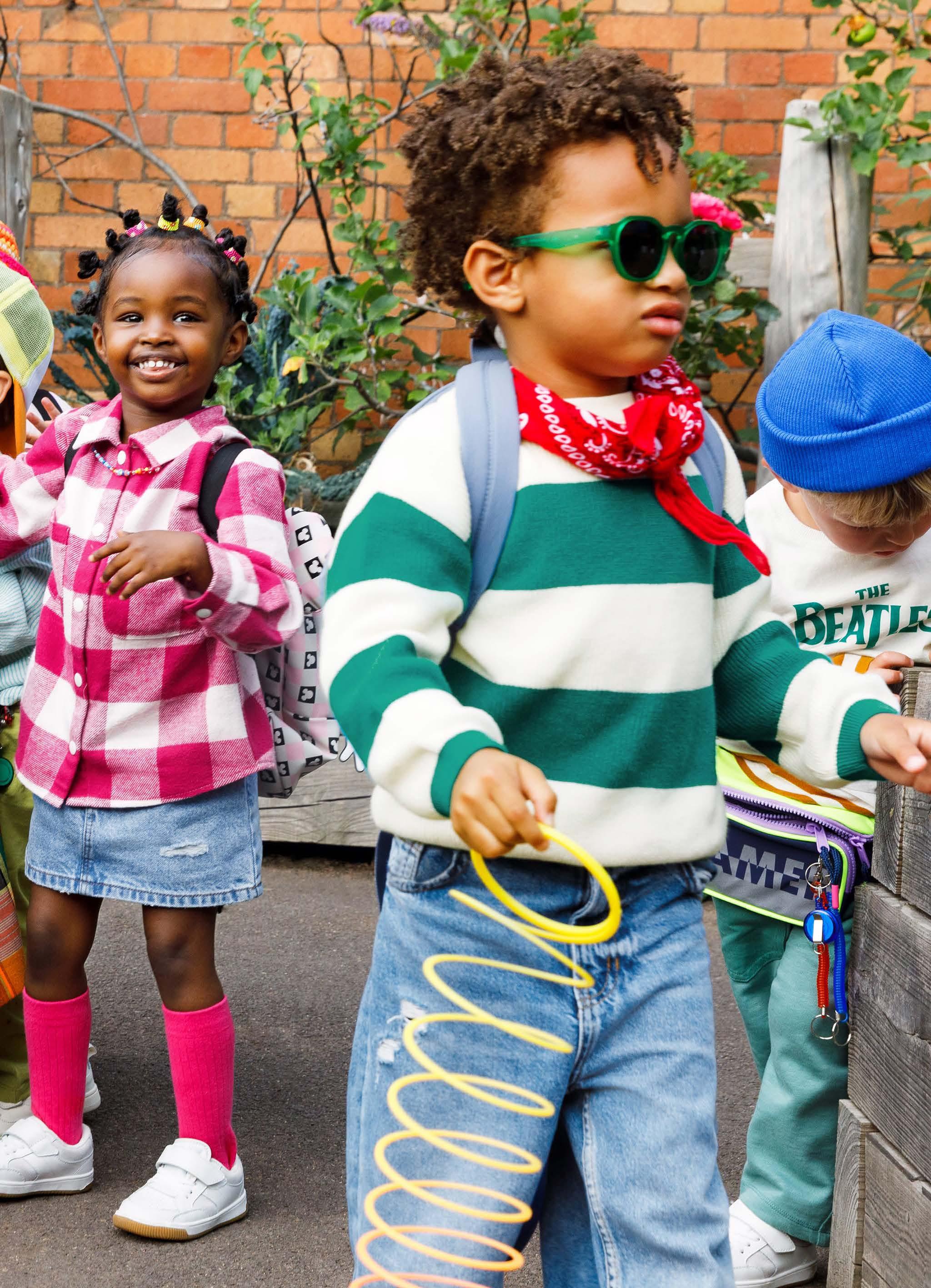 Kim: Forte Forte (jurk). Poespas (sandalen met hak). Ted: HEMA (romper). Mango Kids (tuinbroek). Poespas (speelgoed). Youp: Poespas (t-shirt, blazer en laarzen). Shoeby Jill & Mitch (jeans).
