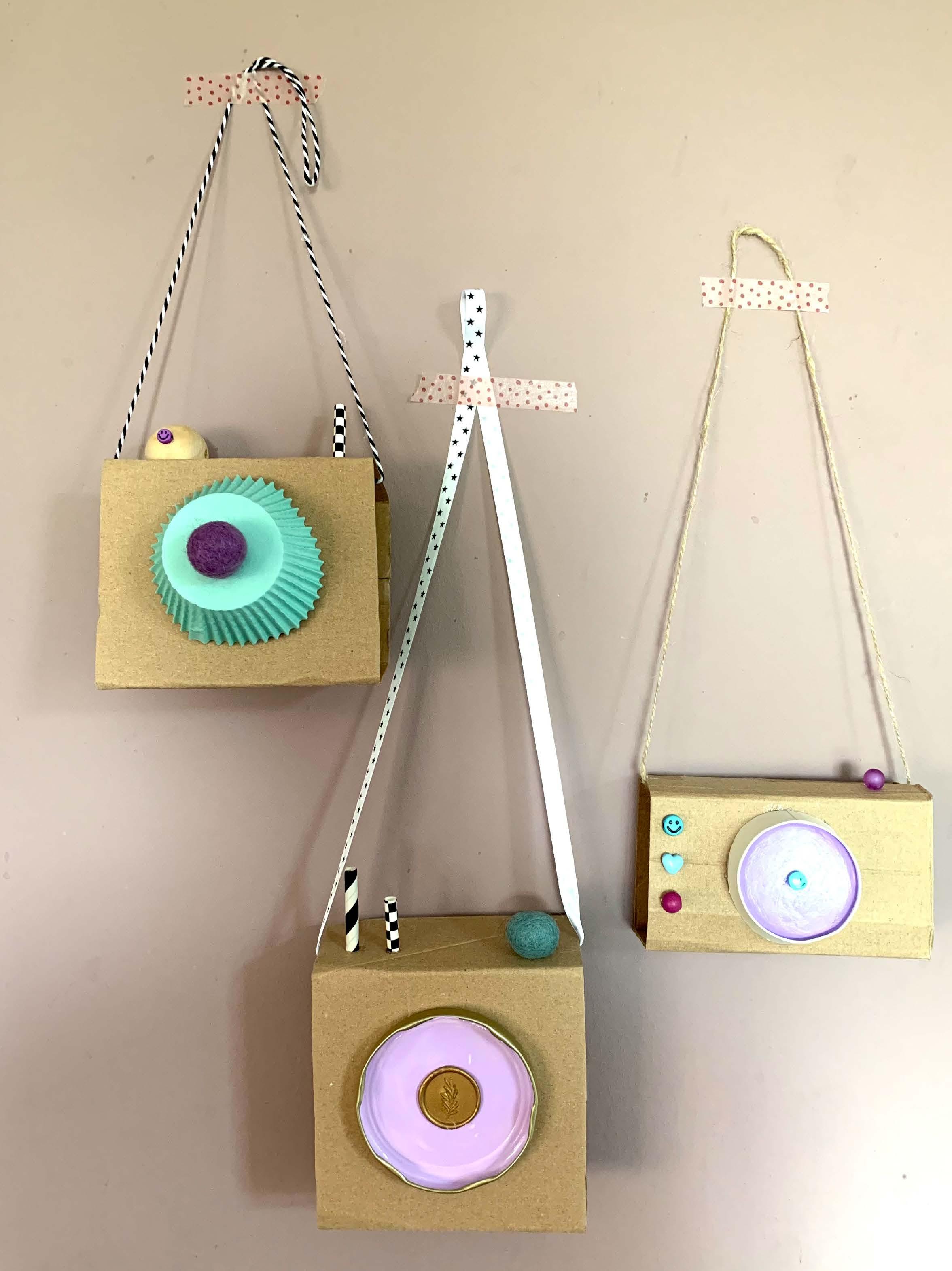 ZO DOE JE HET:Begin met het verven van de deksels, zodat deze even kunnen drogen. Teken dan op het karton de formaten van de fototoestellen en knip deze uit. Als je dit te zwaar vindt omdat het karton te dik is, kun je ook een mesje gebruiken. Vouw ze in vorm en maak ze dicht met lijm of tape. Je kunt natuurlijk ook een kant-enklaar doosje gebruiken. Nu begin je met versieren. De knopjes, de lens, flitser et cetera kunnen er allemaal op geplakt worden. Vervolgens een stuk lint of draad eraan en poseren maar!