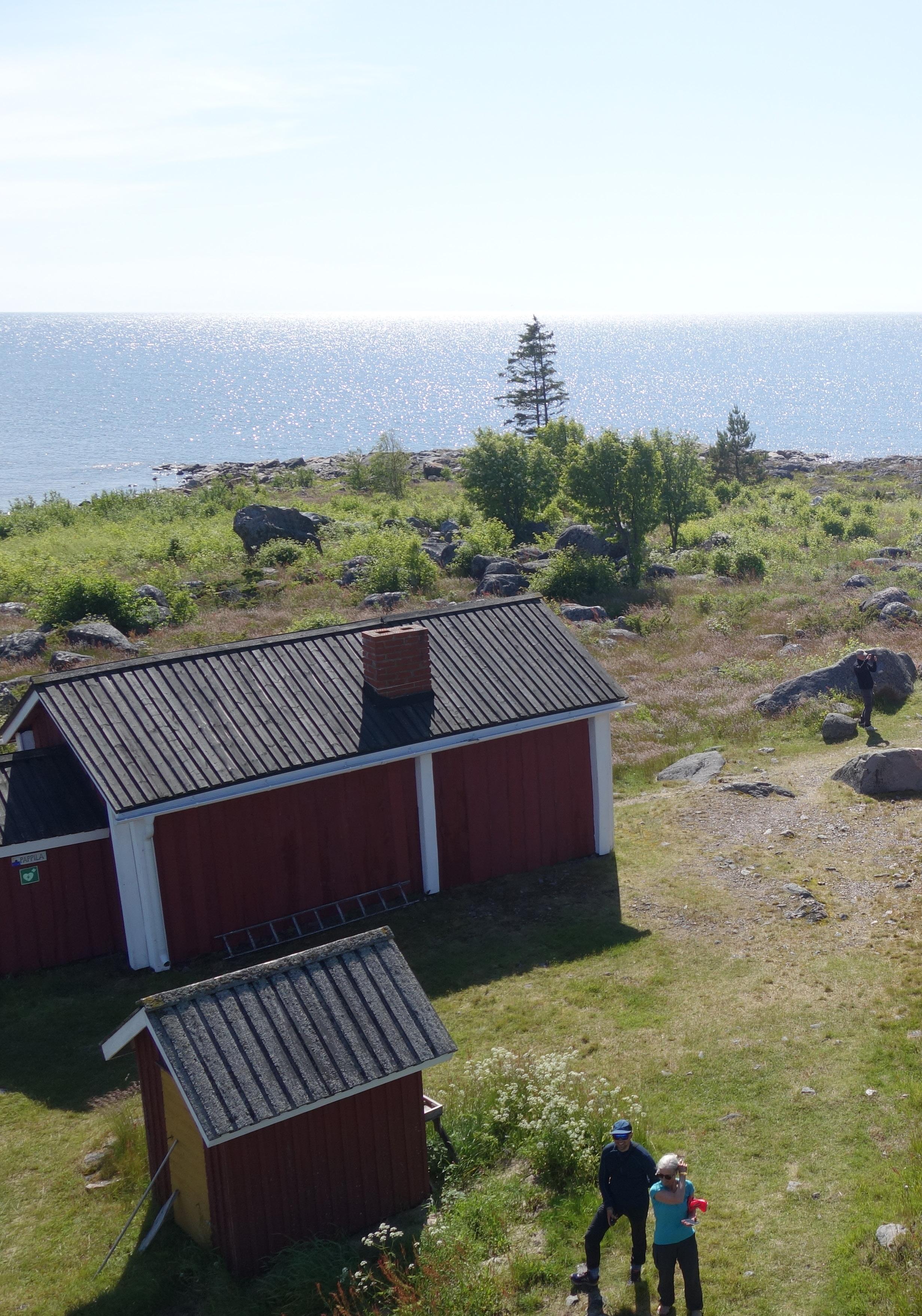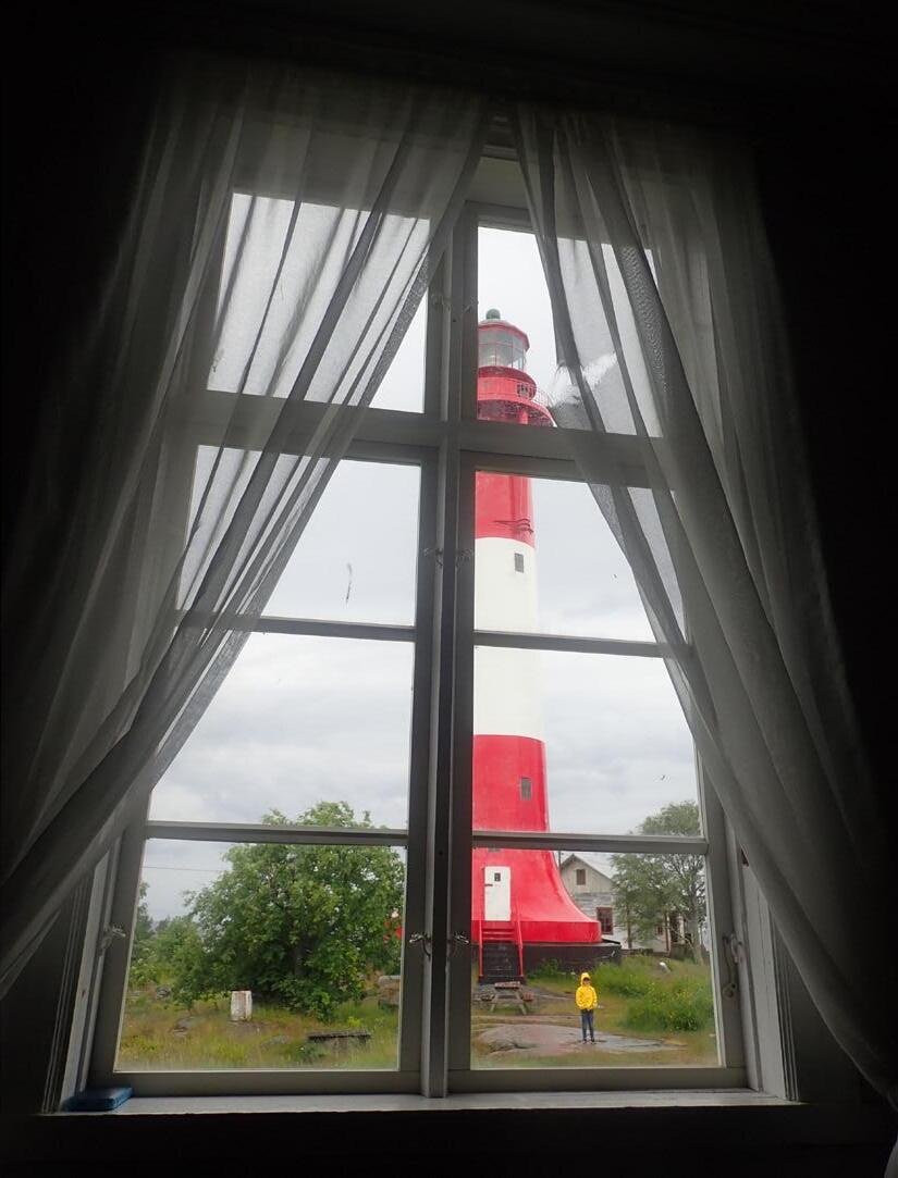 …ja jatkuu parempana. Olimme varanneet majakkamestarin talosta huoneen, ja se on upea. Hirsiseinät, sinivalkopeitteiset vuoteet. Yhteiskeittiö, jättikummelin kivikasa ulkona ja ikkunasta näkymä