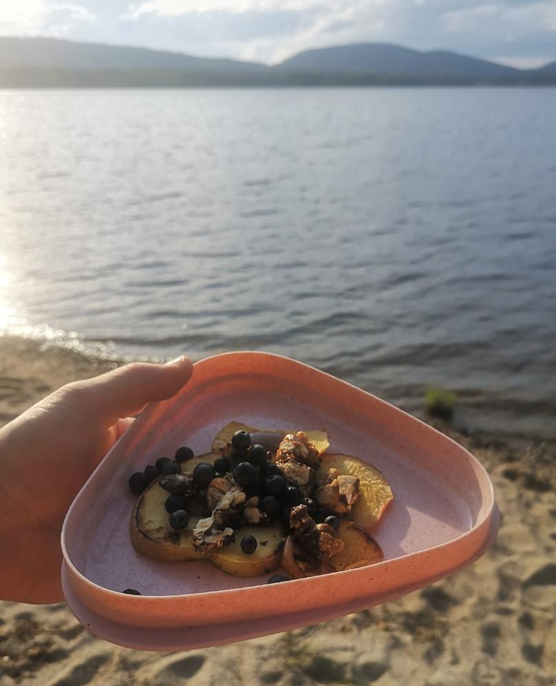 Ainekset: Kajakin pohjalla pari päivää pyörinyt omena, Fazerin sinistä tai muuta suklaata, päiväluukun pähkinäpussista kourallinen pähkinöitä, mustikoita mättäältä, hiukan rasvaa pannulle