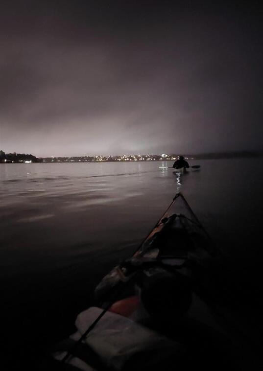 Kauden viimeinen melonta. Marraskuisen meren rauha. Mäntysaaren löylyjen jälkeen pehmeän pimeän myötä kotimatkalle. Olisi tehnyt mieli jäädä kellumaan hämärtyville laineille. Liisa Kemppainen