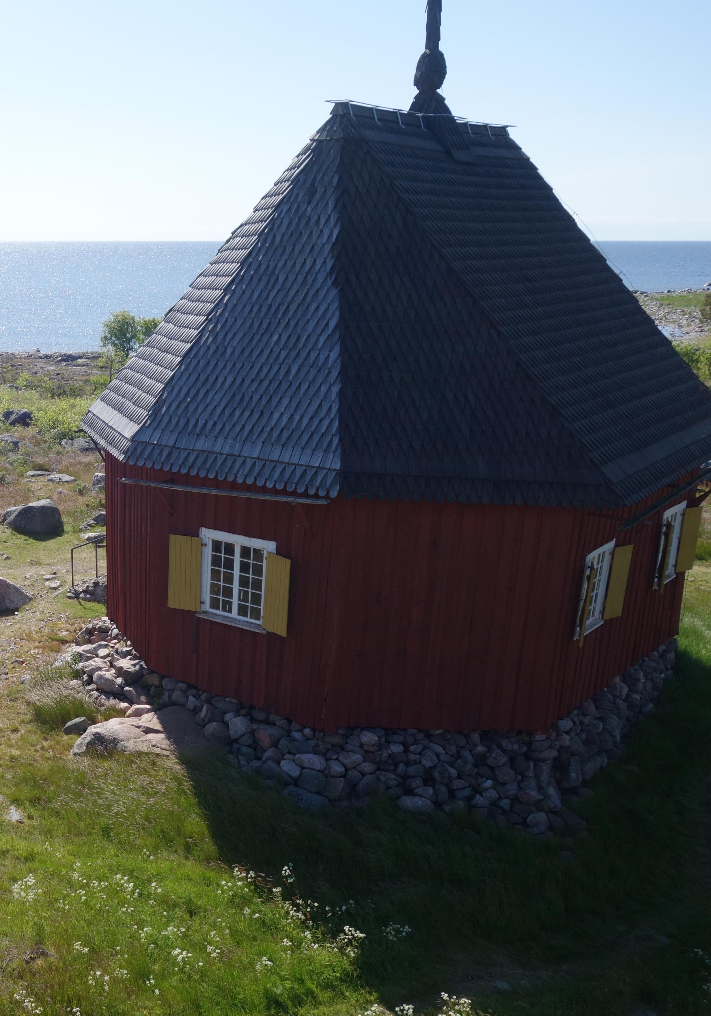 Tankarin punavalkoiselle majakalle, jonka leveä jalusta kaventuu ylös, ylös. Majakka omassa pihassa! Vieressä on saunarakennus, jonka vapaa käyttö kuului hintaan.