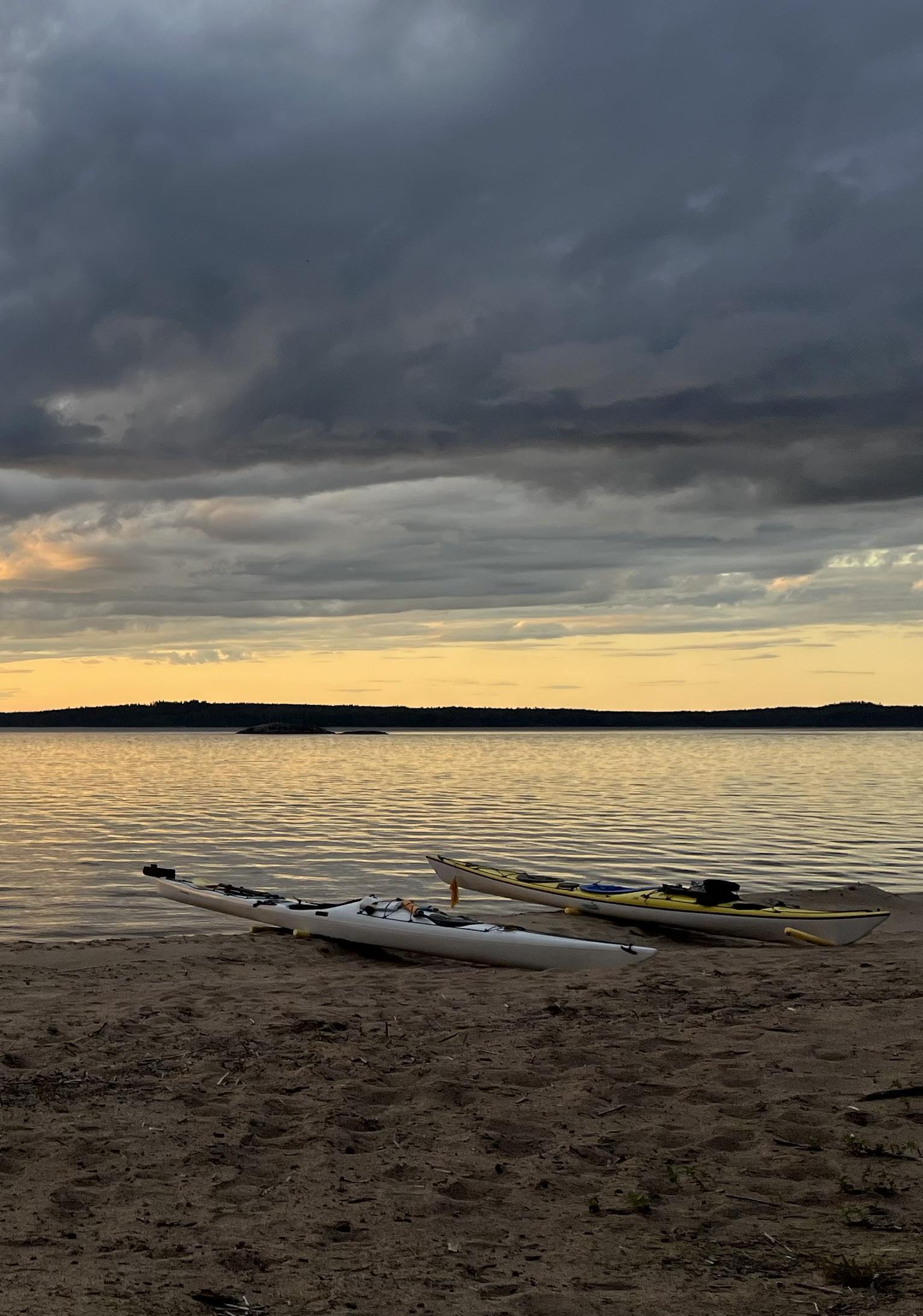 Tällä reitillä tauko- ja yöpaikkoja ei ole missä vain – maa nousee, rannat ovat kiviset, mökkejä on runsaasti –, joten ne kannattaa etukäteen selvittää. Sitten voi ehkä tyytyväisenä löytää Flaskskäretin siloisen hiekkarannan ja Orrskäretin vielä hienommat dyynit, joskin lahti on muotoutunut niin, että ainakin luoteistuulella tulo on tyrskyllä ratsastamista rantaan. Täällä Riitta opettaa, miten täydessä lastissa oleva kajakki käännetään helposti kokka merelle. Poistuminen on nimittäin tehtävä keula edellä krokotiililähtönä ja silti ohjaamo luultavasti kastuu. Mutta sehän on vain jännittävää melojalle ja hauskaa katselijoille.