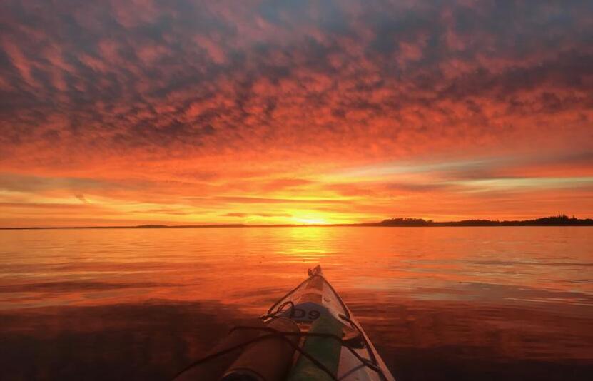 Ensimmäisen vuoden melojan ensimmäinen keulakuva, otettu illansuussa syyskuun viimeisenä viikonloppuna saunareissulta Gåsgrundilta lähtiessä. Yöksi suuntasimme Torra Lövölle. Sini Schulte