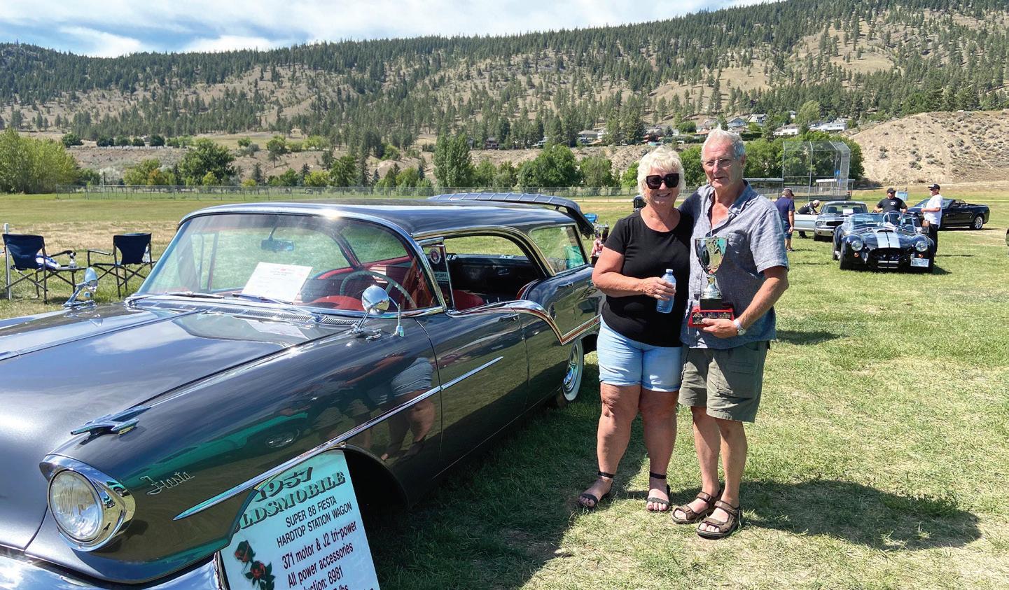 Dave Soball of Kaleden, B.C. won this year’s Show ‘n’ Shine with his 1957 Oldsmobile Super 88 Fiesta. Soball (right) holds the Mayor’s Choice Trophy. Photo/Mike Goetz