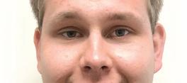 pounds, brown hair and blue eyes, with short hair in a buzz cut.