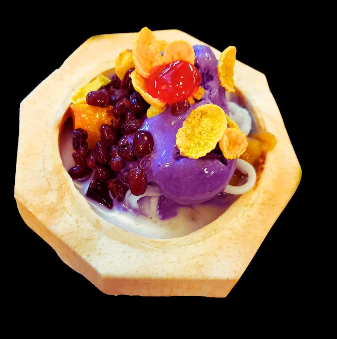 Finish by adding a scoop of ube or coconut ice cream, a piece of leche flan, and a light scattering of toasted pinipig on top