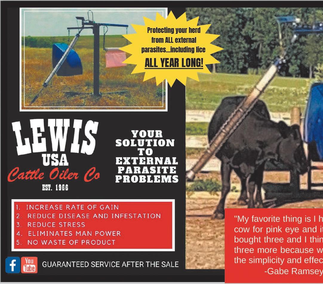 of parasites. P.O. Box 325, DECORAH, IA 52101 or call: (563) 387-0932 • www.easywaycattlecare.com Easy Way Mfg. Brush Oiler Mineral Feeder and Face Fly Fighter Walkway Oiler Buffalo Treatment Station Scratcher and Stand Complete Cattle Saver Buy, Sell, & Trade Farm Equipment New & Used Parts National Locater Service Parting Late Model Tractors & Combines Colfax, IA, North Side of Interstate 80 at Colfax exit. 1-800-284-3001 • colfaxtractorparts.com NO FLY ZONE the 308/850/3286 888/256/5544 WWW.USALEWISCATTLEOILERS.COM May is