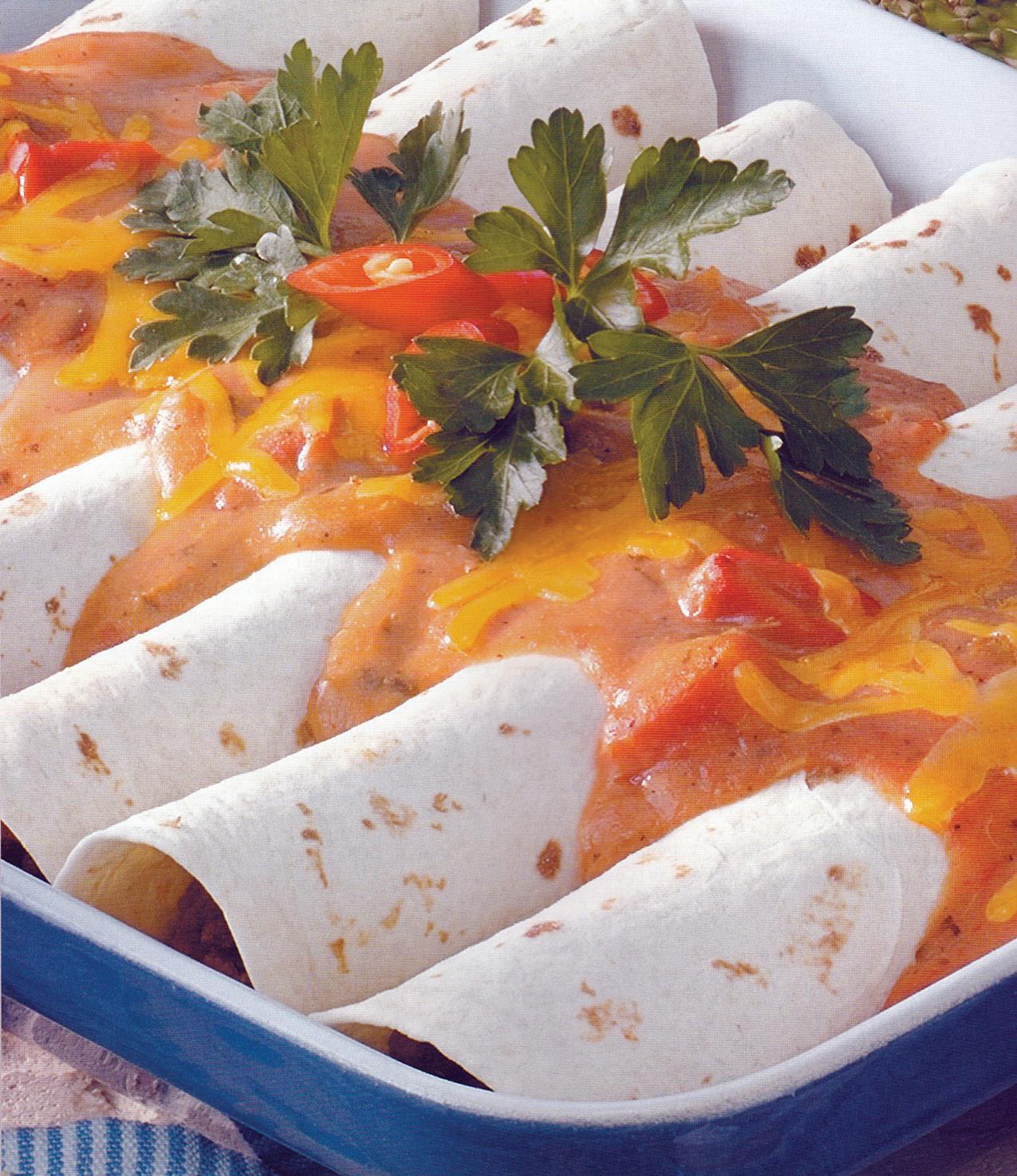 Spread about 2 tablespoons of refried beans, 1⁄4 cup of the beef mixture and 1 tablespoon cheese down the center of each tortilla; roll up. Place seam-side down in two greased 13x9x2-inch baking dishes.