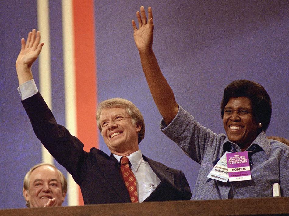 Democratic presidential candidate Jimmy Carter and Rep. Barbara Jordan, D-Texas, wave at the Democratic National Convention in New York’s Madison Square Garden where Jordan gave a speech on July 12, 1976. (AP Photo)