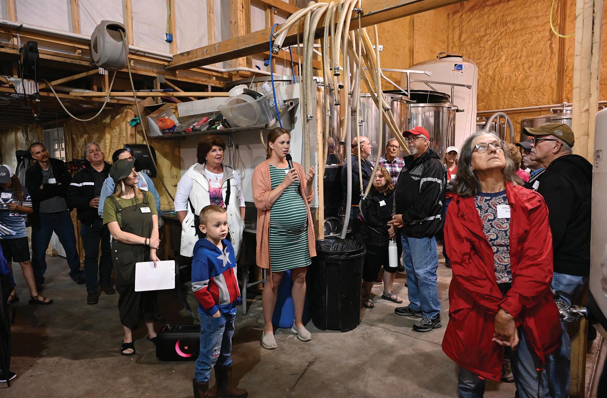 On Sunday, August 6, 2023, Amber Gable, co-owner of Backcountry Winery and Brewery of rural Stratford along with her husband Preston Gable, tells attendees of the Hamilton County Farm Crawl about their process of making wine.