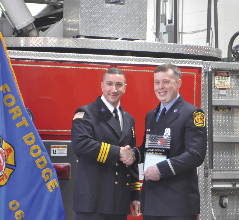 -Messenger file photo by Bill Shea LEFT: Fort Dodge Fire Chief Matt Price, left, presents the Award of Valor to Firefighter/Paramedic Kyle Porter in April. Porter was honored for holding together two ladders to help a woman escape from a third floor window during a Nov. 17, 2024, fire at 1107 Central Ave.