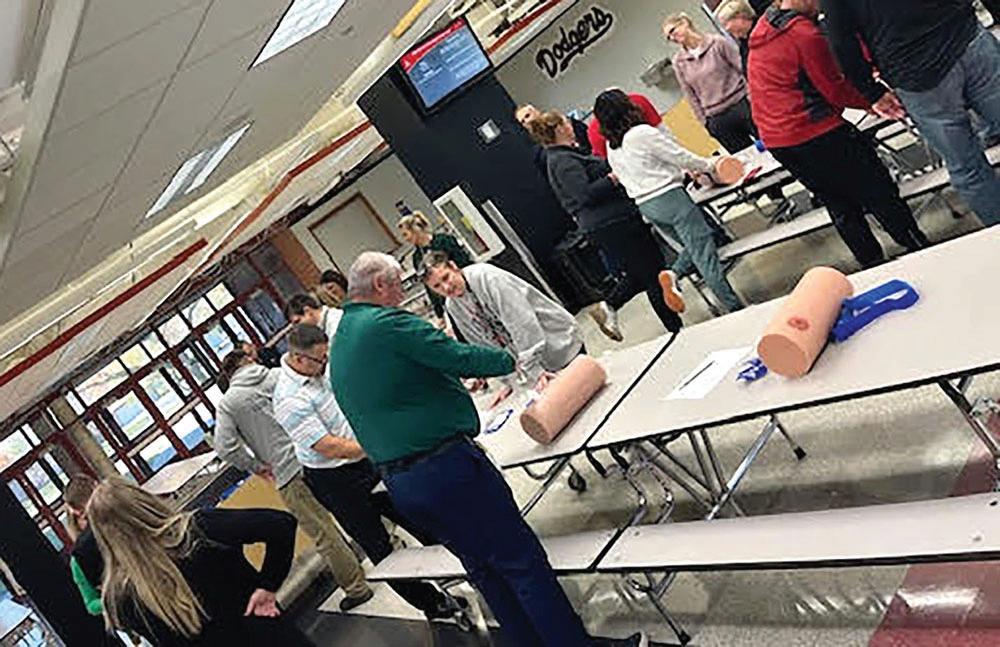 TOP PHOTO: Staff from the Fort Dodge Community School District as well as St. Edmond Catholic School received training to correctly use a tourniquet and pack wounds.