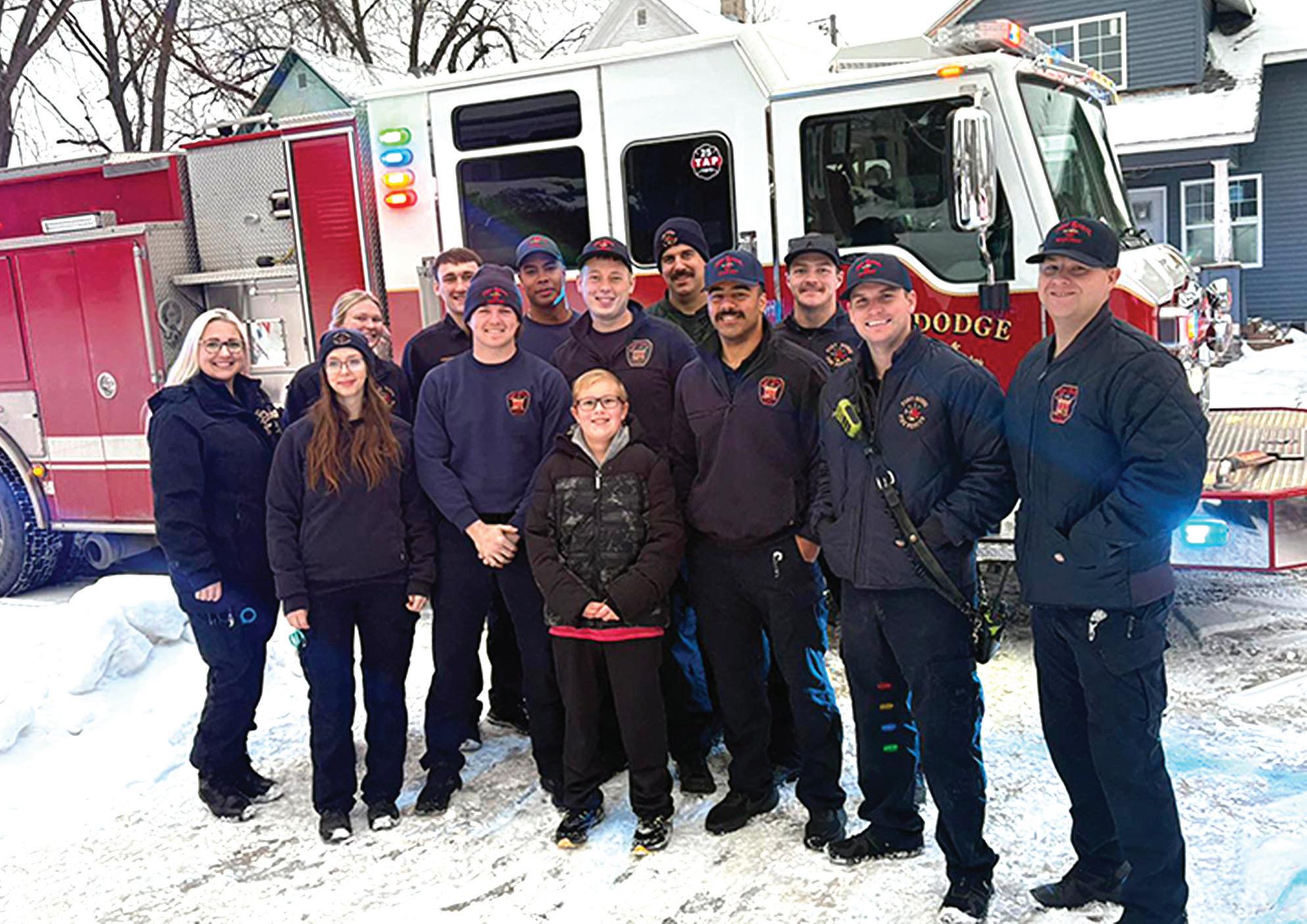 ABOVE: Colton Holmes, center, was accompanied to school by the members of the Fort Dodge Fire Department who responded to a fire and were assisted by his previous work to clear snow away from a hydrant. They are, from left, Paramedic Andrea Brandt, EMT Katelyn Rodenborn, Firefighter/EMT Taryn Sutton, Firefighter/EMT Zach Rossmanith, Firefighter JJ Durflinger, Firefighter/Paramedic Mychal Edler, Firefighter/Paramedic Kyle Porter, Lt. Jon Schrek, Firefighter Gionni Hamilton, Firefighter/Paramedic Aaron Campbell, Lt. Devon Schuster and Firefighter/Paramedic Stephan Cook.